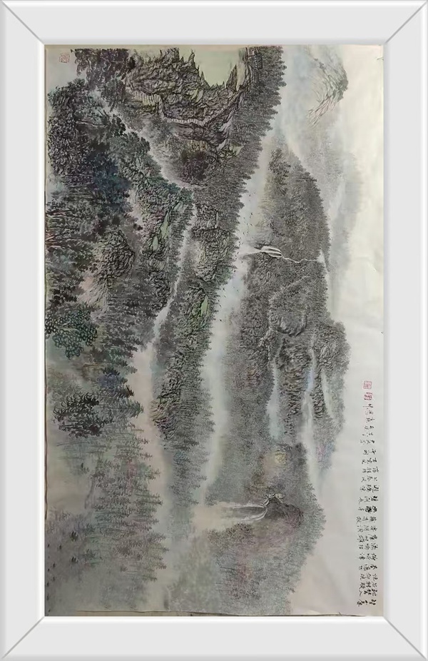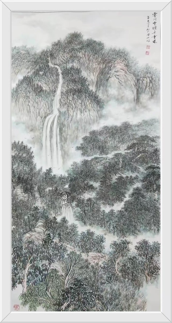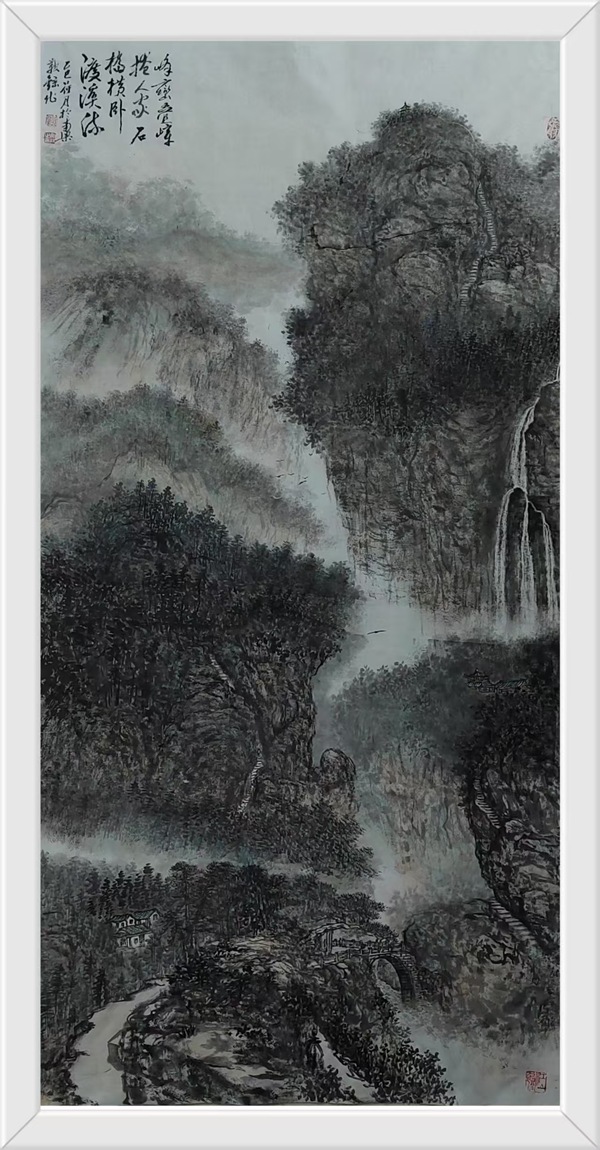构图如造园,需深谙「开合之道」与「虚实之妙」。经典的「品字形三叠法」恰似搭建水墨舞台的黄金框架,通过山石的错落形成「开」的空间张力,又以云雾、溪流实现「合」的气韵贯通。留白之处暗藏玄机——蜿蜒的水流似S形舞动,峭壁的走势若Z形延伸,这些无形的韵律构成画面的呼吸节奏。更需领悟矛盾统一的哲学智慧:近景的重墨与远景的淡彩形成视觉对话,密集的苔点与大面积留白达成疏密平衡,让二维宣纸承载三维的空间诗意。