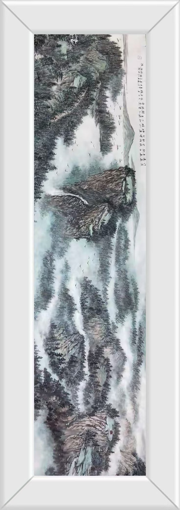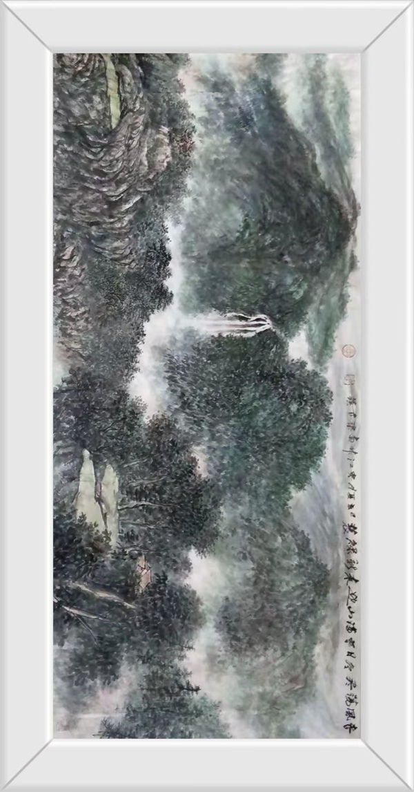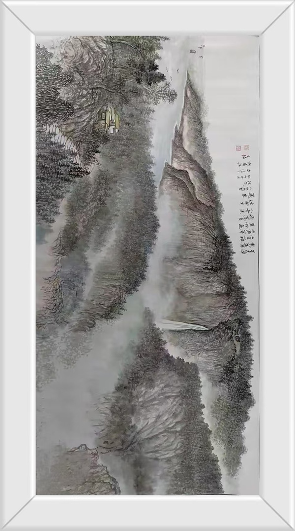 构图如造园,需深谙「开合之道」与「虚实之妙」。经典的「品字形三叠法」恰似搭建水墨舞台的黄金框架,通过山石的错落形成「开」的空间张力,又以云雾、溪流实现「合」的气韵贯通。留白之处暗藏玄机——蜿蜒的水流似S形舞动,峭壁的走势若Z形延伸,这些无形的韵律构成画面的呼吸节奏。更需领悟矛盾统一的哲学智慧:近景的重墨与远景的淡彩形成视觉对话,密集的苔点与大面积留白达成疏密平衡,让二维宣纸承载三维的空间诗意。